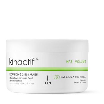 Todos los productos de la línea Kinactif Volume, son ideales para aquellos cabellos finos, frágiles y/o sin volumen que buscan ganar en densidad y resistencia. Además todos los productos Kinactif de KIN Cosmetics, combinan una fórmula dual para ejercer una doble acción sobre el cuidado del cabello y el cuero cabelludo. En este caso, la fórmula 100% vegana de Kinactif Volume Mask contiene: