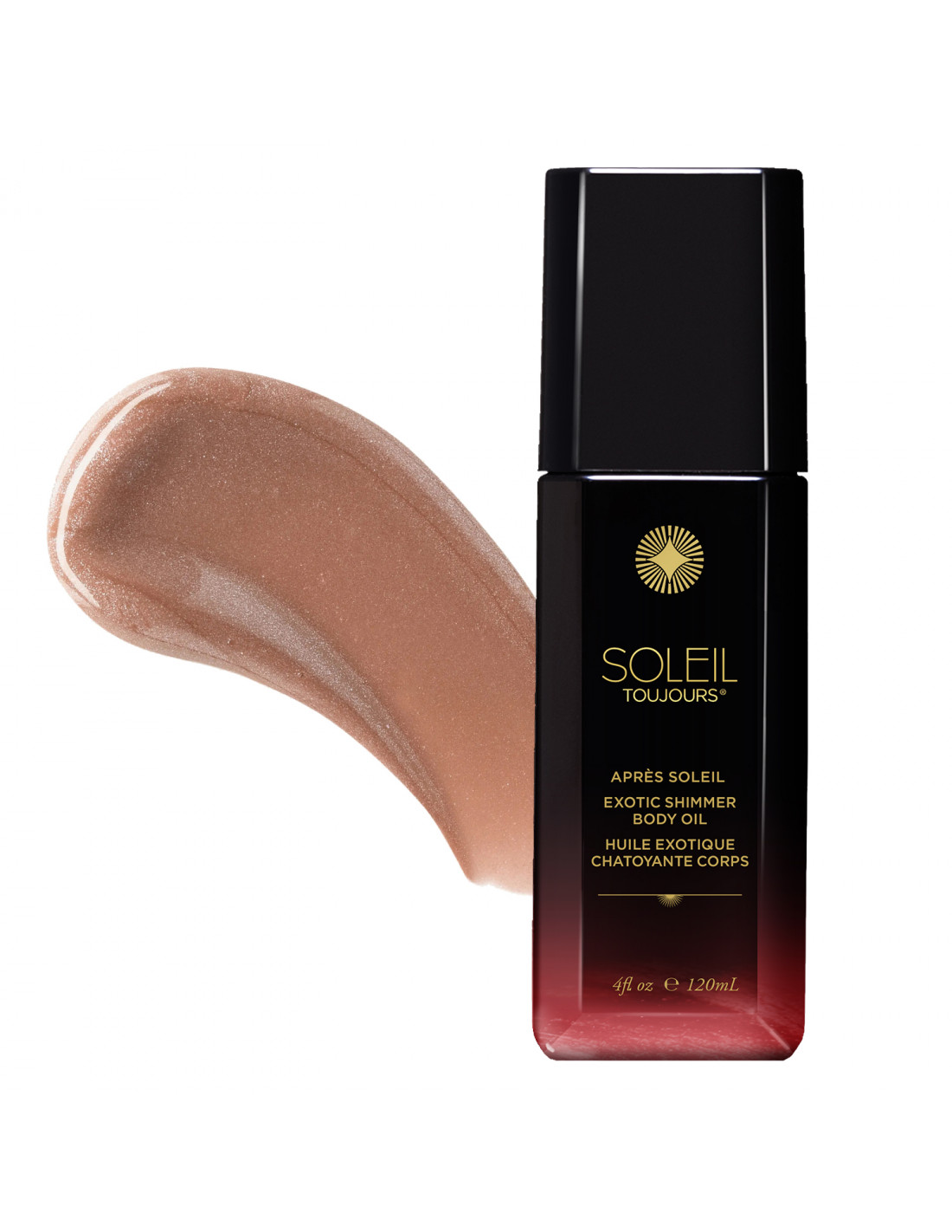Exotic Shimmer Body Oil de Soleil Toujours (59€) es un aceite seco capaz de conseguir un efecto glow al mismo tiempo que nutre en profundidad. Su fórmula patentada EcoSun Complex mejora la textura de la piel previniéndola de la pérdida de firmeza. Entre su rico listado de activos, encontramos eminencias como la vitamina C y E, el ácido hialurónico o los extractos de hoja de té y alga roja. A destacar también en su composición, la riqueza que le aportan el aceite de rosa de mosqueta, para ayudar a regenerar el tejido cutáneo, aceite de argán muy rico en antioxidantes e híper-nutritivo y el extracto de romero que contribuye a mejorar la apariencia y el tono de las manchas oscuras en la piel que aparecen con la edad.
