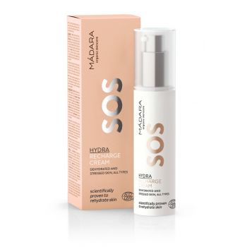 - Hidrata tu piel por dentro y por fuera a diario. Es muy importante beber mínimo 1,5 litros de agua al día incluso en invierno, pero también lo es elegir una buena crema con hidratación intensa según tu tipo de piel y la zona a tratar. Intensa no quiere decir densa o con una consistencia demasiado cremosa (esto ya es historia). Para el rostro, una muy buena elección es la crema hidratante para piel estresada SOS Hydra recharge cream de Mádara. Es ligera, flexible, no aporta peso y se absorbe muy bien.